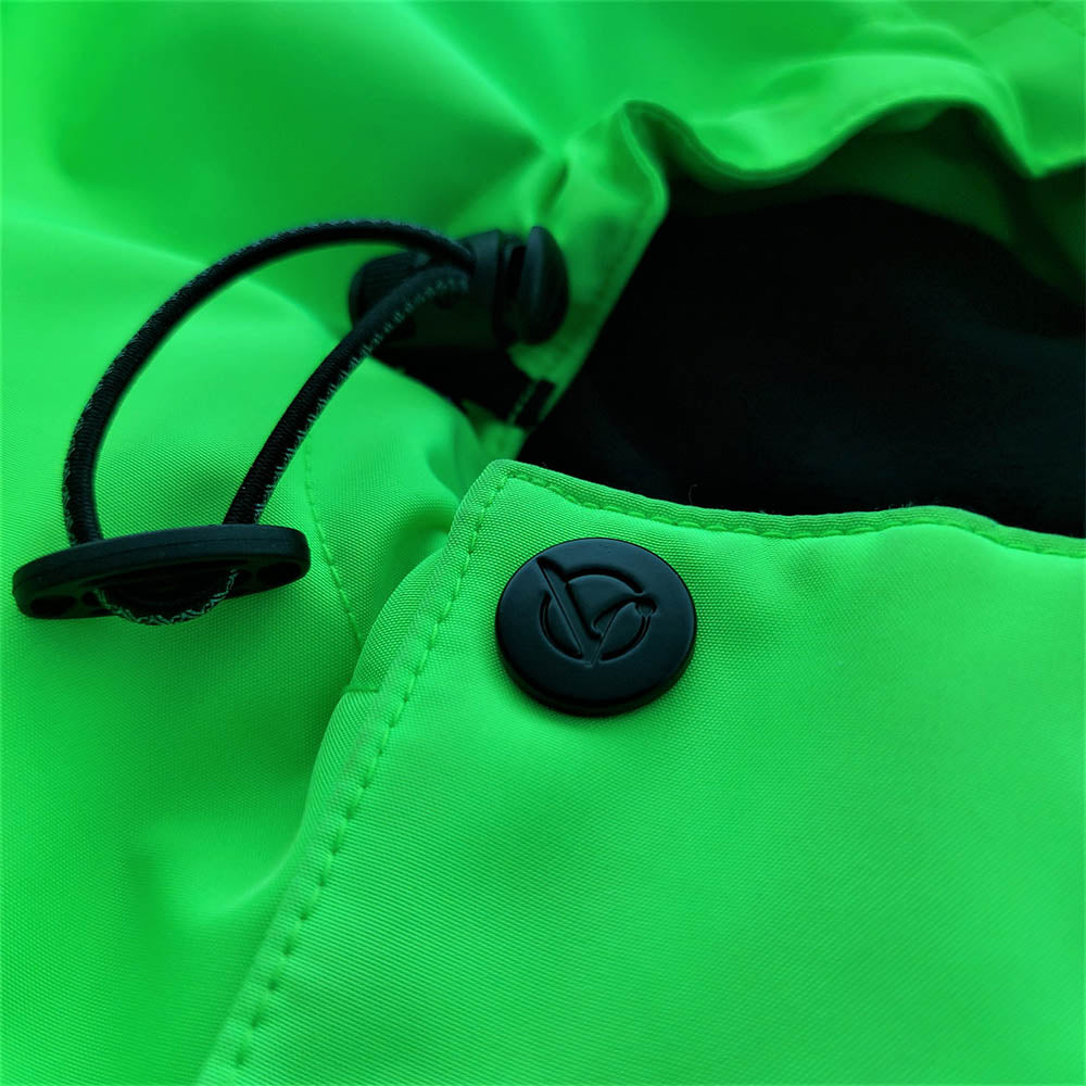 - Helmet-sized storm hood with flexible brim and snap fastener